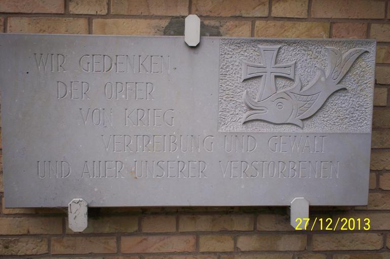 | Keywords: Schwartau Regina Caeli 2306.JPG Die Kirche Maria Königin auch Marienkirche oder Regina Caeli in der Geibelstraße Bad Schwartau Gedenktafel an der an der Außenwand links The Queen of Heaven Church aka Mary Church or Regina Caeli in the Geibelstraße Bad Schwartau Schleswig-Holstein Germany Memorial plaque own 2013-12-27 Ulf Heinsohn my own work timestamp Kirche Maria Königin Bad Schwartau Plaques in Kreis Ostholstein Bad Schwartau Marienkirche Monuments and memorials to Heimatvertriebene in Schleswig-Holstein BadSchwartau War memorials in Schleswig-Holstein Bad Schwartau Marienkirche Monuments and memorials to victims of National Socialism in Schleswig-Holstein Bad Schwartau Marienkirche Monuments and memorials in Bad Schwartau Tote Krieg Vertreibung Gewalt |