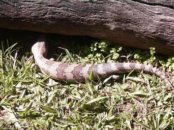 Keywords: Scincidae Aus Zoo Aug06.JPG Photo of a lizard unknown w Scincidae with part of head obscured by the shadow of a log Either Tiliqua scincoides or w Cyclodomorphus gerrardii Taken by Andjam on August 3 2006 at w Australia Zoo Queensland Australia 2006-08-03 own assumed Andjam Unidentified Scincidae |