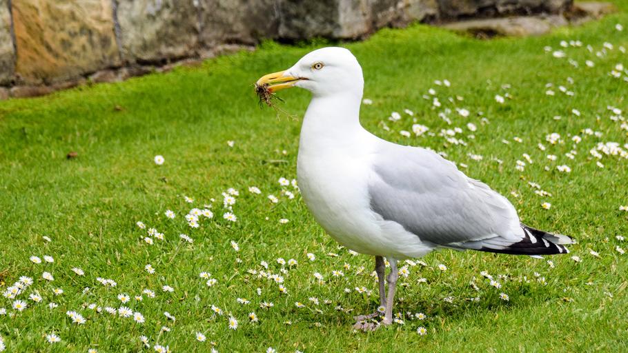 Keywords: scotland st andrews seagull sit meadow daisy eat nature grass bird