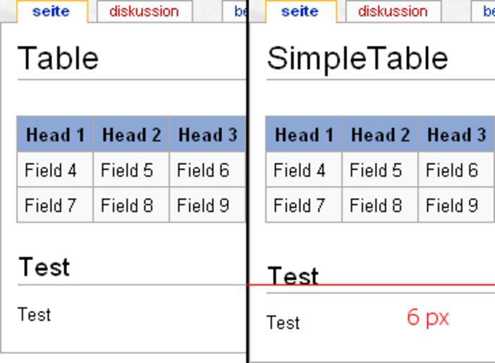 | Keywords: Screenshot-SimpleTable-bug.gif SimpleTable extension The left side is used for comparison and shows a table which was generated with the normal table syntax This bug causes all elements below the table to be displaced by six pixels SimpleTable-Erweiterung Die linke Seite dient zum Vergleich und stellt eine Tabelle dar die mit der normalen Tabellen-Syntax erzeugt wurde Durch diesen Bug verschieben sich Elemente unter der Tabelle um sechs Pixel own WikiMichi 2009-11-22 Screenshots of MediaWiki extensions Wikitable |