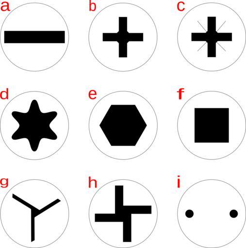 | Keywords: Screw drive types2.svg Типы отвё ток Screwdriver types own work remake of Image Screw drive types png 2007-04-04 user one_half_3544 thumb left original version thumb left another incomplete svg version v 25em translation possible Captions en icon English a Slotted<br> b Phillips<br> c Pozidriv<br> d Torx<br> e Hex key<br> f Robertson<br> g Tri-Wing<br> h Torq-Set<br> or Four-Wing i Spanner<br> de icon Deutsch a Schlitz<br> b Kreuzschlitz/Phillips<br> c Pozidriv<br> d Torx<br> e Inbus<br> f Vierkant<br> g Tri-Wing<br> h Torq-Set<br> i Spanner<br> fr icon Français a tête fendue<br> b cruciforme ou Phillips <br> c Pozidriv<br> d Torx<br> e hexagonale creuse ou six pans creux - ou BTR - ou Allen <br> f carré ou Robertson <br> g Tri-Wing<br> h Torq-Set<br> i snake-eye ou Spanner <br> ru icon Русский a Шлицевая<br> b К естовая Филипс<br> c Позид айв<br> d Звёздооб азная Torx<br> e Шестиг анная<br> f Квад атная<br> g Tri-Wing т еугольная <br> h К естовая Torq<br> es icon Español a Plano<br> b Phillips o Estrella<br> c Pozidriv<br> d Torx<br> e Allen<br> f Robertson<br> g Tri-Wing<br> h Torq-Set<br> i Spanner<br> Drawings of screw heads |