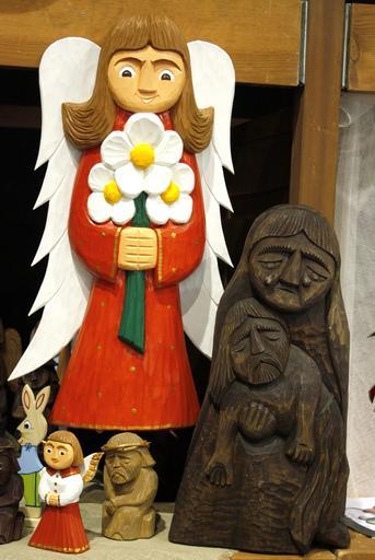 Keywords: sculpture wood carving face girl flowers color red wood popular manual work the art of świątki