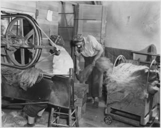 | Keywords: Scutched fiber is removed from the scutcher and arranged for combing process - NARA - 283921.jpg Scope and content Two operations breaking and scutching free the fiber in the flax stem from the woody parts The scutcher machine pictured can turn 3 1/2 tons of ratted flax into flas fiber in an 8-hour day Note the masks worn by workers to protect from dust and fluff particles General notes 283921 Local identifier Department of Agriculture Agricultural Research Service 06/17/1981 - NARA's Central Plains Region Kansas City NREA 400 West Pershing Road Kansas City MO 64108 other date ~ 1945 Record group Record Group 54 Records of the Bureau of Plant Industry Soils and Agricultural Engineering 1853 - 1977 Record group ARC 383 Flax Project Photographs compiled 1908 - 1977 Series ARC 283896 File unit File unit ARC Variant control numbers NAIL Control Number NRE-54-FP PHO -156 Other versions <gallery> File Scutched_fiber_is_removed_from_the_scutcher_and_arranged_for_combing_process_-_NARA_-_283921 tif tif File Scutched_fiber_is_removed_from_the_scutcher_and_arranged_for_combing_process_-_NARA_-_283921 jpg jpg </gallery> NARA-cooperation PD-USGov Dressing flax 1940s fashion Women at work in World War II |
