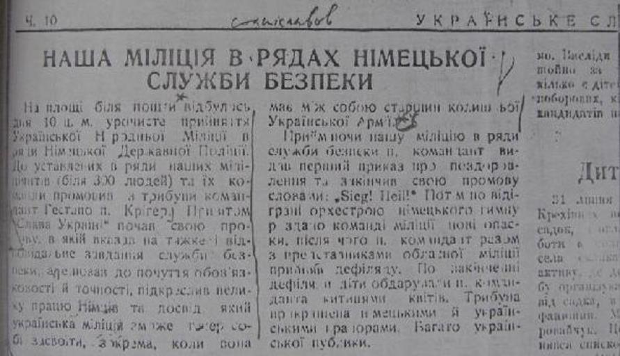 Keywords: Sdukrmilitia1941.jpg en Bandera`s en OUN Militia join the en Sicherheitspolizei/ en Gestapo Celebration report en Stanislaviv 10 August 1941 Occupied Eastern Poland газета «Ук аїнське Слово» 13 August 1941 - image copy- own Ukrainische Hilfskommitee für Lemberg-Land newspapers July/August 1941 1941-08-13 PD-Ukraine 1940s text in Ukrainian <blockquote> а площі біля пошти відбулись дня 10 цього місяця у очисте п ийняття Ук аїнської а одної іліції в яди імецької Де жавної поліції До уставлених в яди наших міліціянтів біля 300 людей та їх команди п омовив командант Гестапо п К іге П ивітом Слава Ук аїні почав свою п омову в якій вказав на тяжке і відповідальне завдання служби безпеки апелював до почуття обовязковості й точності підк еслив велику п ацю імців та досвід який ук аїнська міліція може тепе собі засвоїти зок ема коли вона має між собою ста шин колишньої Ук аїнської А мії П иймаючи нашу міліцію в яди служби безпеки пан командант видав пе ший наказ п о поздо овлення та закінчив свою п омову словами Sieg Heil Потым по відіг анні о кест ою німецького гімну оздано команді міліції нові опаски після чього пан командант азом з п едставниками обласної міліції п ийняв дефляду По закінченні дефляди діти обда ували команданта китицями квітів Т ибуна п ик ашена німецькими й ук аїнськими п апо ами Багато ук аїнської публіки газета «Ук аїнське слово» се еда 13 08 1941 </blockquote> text in English cc-by-sa-3 0 GFDL Bandera's OUN Ukrainian People's Militia