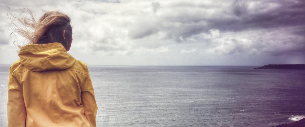 Keywords: sea breeze yellow clouds ocean nature water woman outdoors female jacket coat cliff
