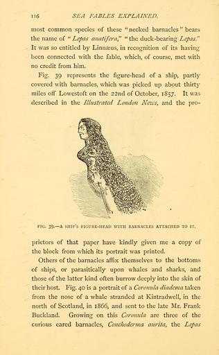 | Keywords: Sea fables explained (14966852514).jpg  ii6 <br> SEA FABLES EXPLAINED <br> most common species of these necked barnacles bears <br> the name of Lepas anatifera' ' the duck -bearing LepasT <br> It was so entitled by Linnaeus in recognition of its having <br> been connected with the fable which of course met with <br> no credit from him <br> Fig 39 represents the figure-head of a ship partly <br> covered with barnacles which was picked up about thirty <br> miles off Lowestoft on the 22nd of October 1857 It was <br> described in the Illustrated London News and the pro- <br> FIG 39 ” A SHir'S FIGURE-HEAD WITH BARNACLES ATTACHED TO IT <br> prietors of that paper have kindly given me a copy of <br> the block from which its portrait was printed <br> Others of the barnacles affix themselves to the bottoms <br> of ships or parasitically upon whales and sharks and <br> those of the latter kind often burrow deeply into the skin of <br> their host Fig 40 is a portrait of a Coromila diadema taken <br> from the nose of a whale stranded at Kintradwell in the <br> north of Scotland in 1866 and sent to the late Mr Frank <br> Buckland Growing on this Coronula are three of the <br> curious eared barnacles Conchoderma aurita the Lepas 10985722 41337 10456 Page 116 Text http //www biodiversitylibrary org/page/10985722 1883 10 5962/bhl title 10456 International Fisheries Exhibition; Lee Henry NameFound Barnacles NameConfirmed Barnacles NameBankID 5033555 NameFound Conchoderma aurita NameConfirmed Conchoderma aurita NameFound Coromila diadema NameConfirmed Coronula diadema Linnaeus 1767 EOLID 1025043 NameBankID 522163 NameFound Coronula NameConfirmed Coronula EOLID 102428 NameBankID 2702283 NameFound Lepas NameConfirmed Lepas EOLID 10953572 NameBankID 2702230 NameFound Lepas anatifera NameConfirmed Lepas anatifera EOLID 1020694 NameBankID 2702231 NameFound Linnaeus NameConfirmed Linnaeus NameBankID 4221582 Biodiversity Heritage Library Sea fables explained Mermaids Monsters Are Real Folklore Ocean Smithsonian Libraries bhl page 10985722 dc identifier http //biodiversitylibrary org/page/10985722 bhlMonstersRreal Halloween mermaid smithsonian libraries bhlmonstersrreal halloween Information field Flickr posted date ISOdate 2014-10-21 CC-BY-2 0 BioDivLibrary https //flickr com/photos/61021753 N02/14966852514 2015-08-25 16 53 26 cc-by-2 0 PD-old-70-1923 Sea fables explained Photos uploaded from Flickr by Fæ using a script |
