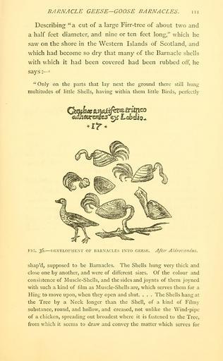 Keywords: Sea fables explained (15563906286).jpg BARNACLE GEESE GOOSE BARNACLES iii <br> Describing a cut of a large Firr-tree of about two and <br> a half feet diameter and nine or ten feet long which he <br> saw on the shore in the Western Islands of Scotland and <br> which had become so dry that many of the Barnacle shells <br> with which it had been covered had been rubbed off he <br> says - <br> Only on the parts that lay next the ground there still hung <br> multitudes of little Shells having within them little Birds perfectly <br> FIG 36 DEVELOPMENT OF BARNACLES INTO GEESE After Aldrovandus <br> shap'd supposed to be Barnacles The Shells hung very thick and <br> close one by another and were of different sizes Of the colour and <br> consistence of Muscle-Shells and the sides and joynts of them joyned <br> with such a kind of film as Muscle-Shells are which serves them for a <br> Hing to move upon when they open and shut The Shells hang at <br> the Tree by a Neck longer than the Shell of a kind of Filmy <br> substance round and hollow and creased not unlike the Wind-pipe <br> of a chicken spreading out broadest where it is fastened to the Tree <br> from which it seems to draw and convey the matter which serves for 10985717 41337 10456 Page 111 Text http //www biodiversitylibrary org/page/10985717 1883 10 5962/bhl title 10456 International Fisheries Exhibition; Lee Henry NameFound Aldrovandus NameFound Barnacles NameConfirmed Barnacles NameBankID 5033555 Biodiversity Heritage Library Sea fables explained Folklore Ocean Smithsonian Libraries bhl page 10985717 dc identifier http //biodiversitylibrary org/page/10985717 bhlMonstersRreal Halloween smithsonian libraries bhlmonstersrreal halloween Information field Flickr posted date ISOdate 2014-10-21 CC-BY-2 0 BioDivLibrary https //flickr com/photos/61021753 N02/15563906286 2015-08-25 16 59 27 cc-by-2 0 PD-old-70-1923 Sea fables explained Photos uploaded from Flickr by FĂŚ using a script |