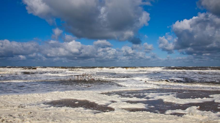 Keywords: sea north sea holland coast water grass beach dunes sunset summer sky coastal protection foam spray clouds nature naturgewald gulls