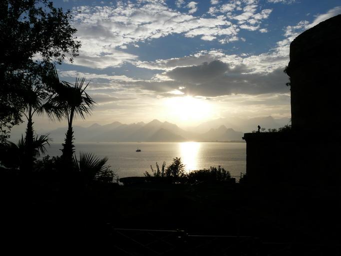 Keywords: sea outlook palm trees idyll holiday ocean mountains sunset sunbeam antalya turkey