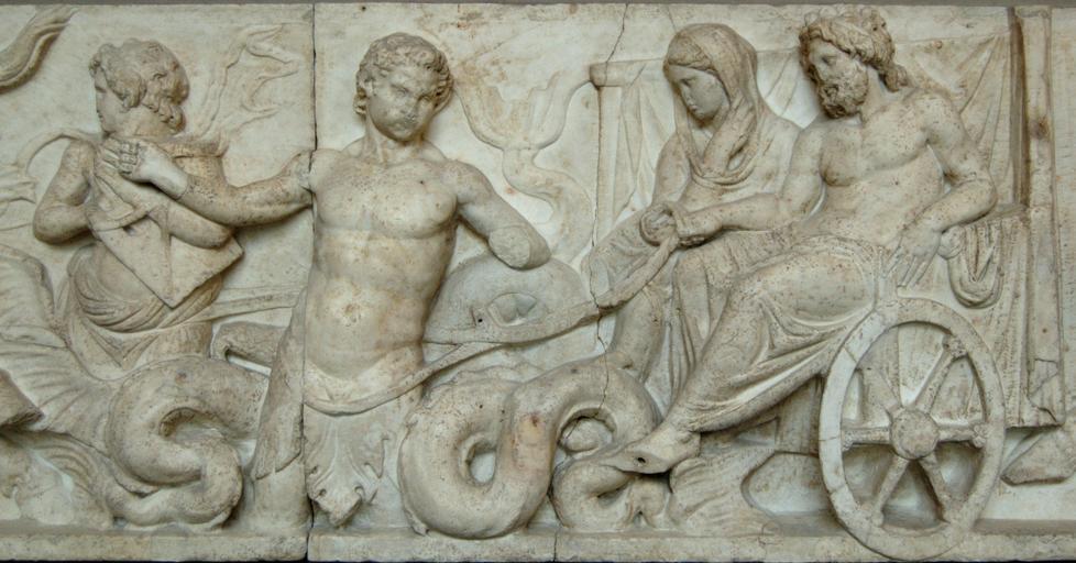 | Keywords: Sea thiasos Amphitrite Poseidon Glyptothek Munich 239 front n3.jpg So genannte »Altar von Domitius Ahenobarbus« oder »Statuebasis von Marcus Antonius« Relieffriese von der Basis einer monumentalen Figurengruppe Meerthiasos für der Hochzeit von Poseidon und Amphitrite 2 Hälfte des 2 Jahrhunderts v Chr Einzelheit Poseidon und Amphitrite im Hochzeitwagen gezogen durch zwei musizierende Tritonen Vorderseite So-called Altar of Domitius Ahenobarbus or Statue Base of Marcus Antonius relief freize of a monumental statue group base Sea thiasos for the wedding of Poseidon and Amphitrite 2nd half of the 2nd century BC Detail Poseidon and Amphitrite in the bridal carriage drawn by two Tritons playing music front panel « Autel de Domitius Ahenobarbus » ou « base de statue de Marcus Antonius » frise en relief de la base d'un groupe statutaire monumental Thiase marin pour les noces de Poséidon et Amphitrite 2e moitié du IIe siècle av J -C Détail Poséidon et Amphitrite dans le chariot nuptial tiré par deux Tritons jouant de la musique Ara di domizio enobarbo Thiasos marina Nettuno e Anfitrite su un carro trainato da tritoni Museum Glyptothek Munich Room 11 Saal der römischen Bildnisse object history credit line accession number Inv 239 User Bibi Saint-Pol own work 2007-02-08 other versions See Category Altar of Domitius Ahenobarbus Amphitrite Sculptures of Poseidon Tritons in antique art Wedding transport Relief from the altar of Domitius Ahenobarbus in the Glyptothek Munich Ancient Greek reliefs Stone reliefs of nude men |