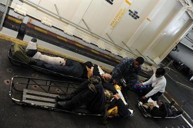 MAKE A MEME View Large Image Sea trials 121204-N-MR217-163.jpg en U S sailors prepare to transport simulated injured sailors on a weapons elevator during a mass casualty training exercise in the hangar bay of the aircraft carrier USS George H W Bush during sea trials ...
