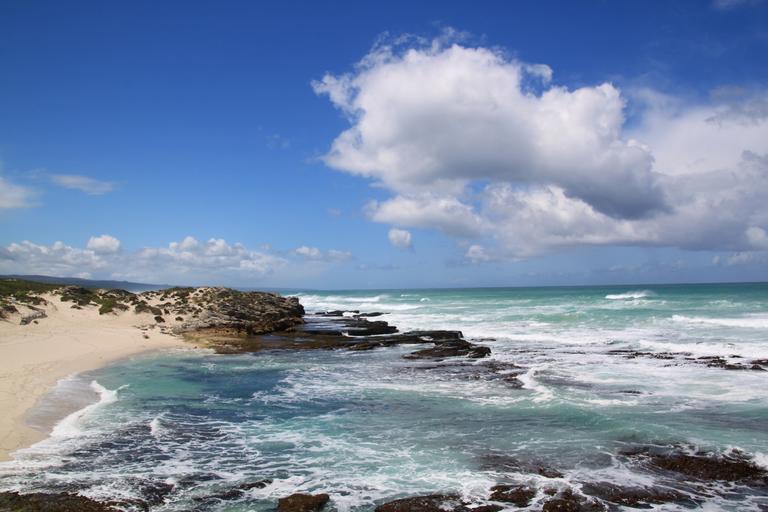 Keywords: sea water wave beach clouds coast rock stones cloud movement beautiful rest landscape sky sand dunes blue white sand beach idyll africa mood maritime south africa