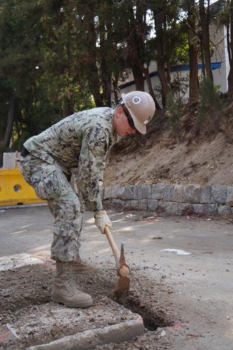 | Keywords: Seabees continue humanitarian work, construction operations in Pacific 140222-N-QJ900-256.jpg en A Seabee from Naval Mobile Construction Battalion 1 Detail Chinhae uses a pickaxe to break compacted soil and rocks around a concrete slab Feb 22 2014 NMCB 1 Detail Chinhae is tasked with preparing a side road to the Turtle Cove Dining Facility where the Republic of Korea contractors will lay asphalt Aligned with Secretary of the Navy Ray Mabus' four priorities of people platforms partnerships and power NMCB 1 will deliver the Navy's forward presence through its work with several host nations at its CCADs in the Pacific and will continue to conduct construction operations in the Northern Command U S Navy photo by Aviation Boatswain's Mate 3rd Class Leanna Manke/Released <br>Unit Naval Mobile Construction Battalion 1 2014-02-21 NMCB https //www dvidshub net/image/1177517/seabees-continue-humanitarian-work-construction-operations-pacific 140222-N-QJ900-256 2014-03-02 01 24 CHINHAE KR PD-USGov-Military-Navy Photographs by Defense Video and Imagery Distribution System Ray Mabus in 2014 Images from DoD uploaded by Fæ |