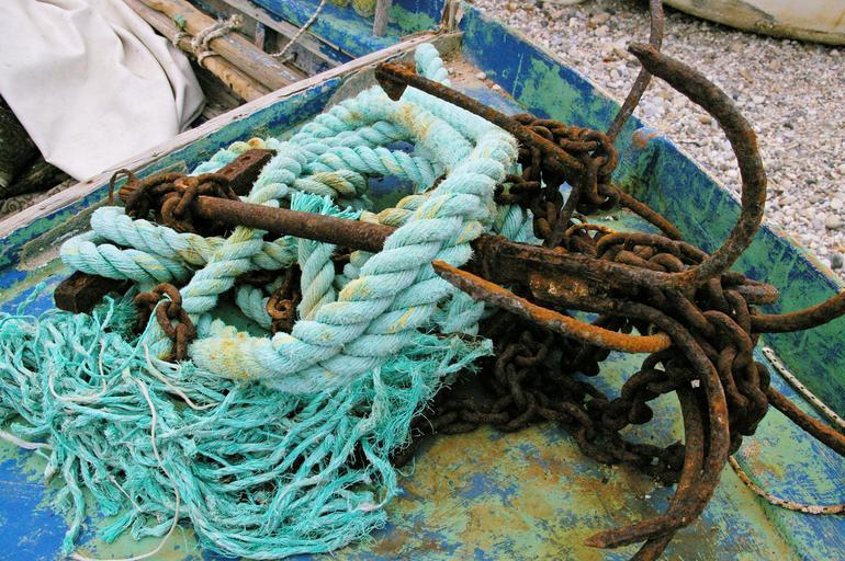 Keywords: seafaring anchor harness lines rope holiday maritime boot ship shipping stainless old rusted fischer fishing coast sea mediterranean blue water fishing boat wooden boat