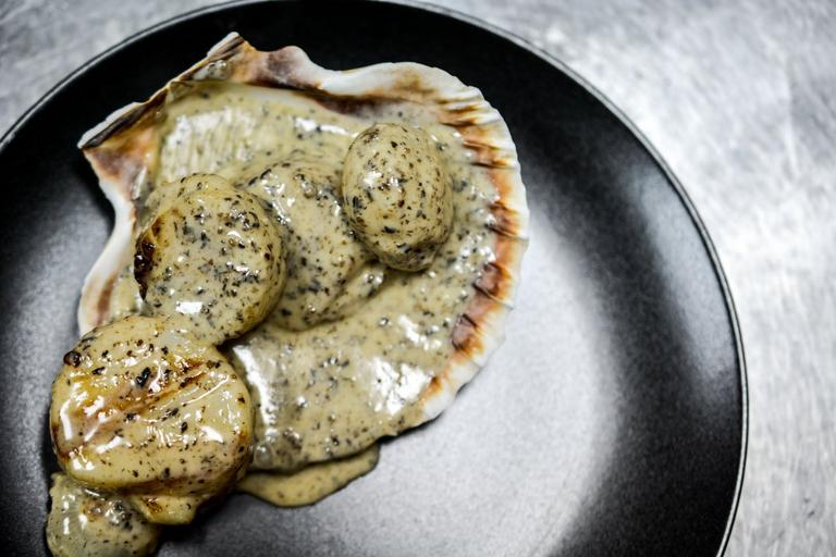 Keywords: seafood food truffles scallop souse dish restaurant coocking
