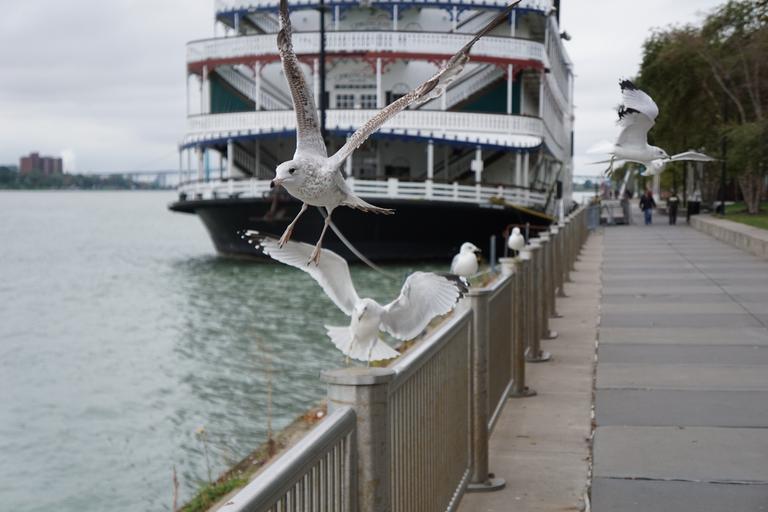 Keywords: seagulls river water nature wildlife flying bird gull day boat