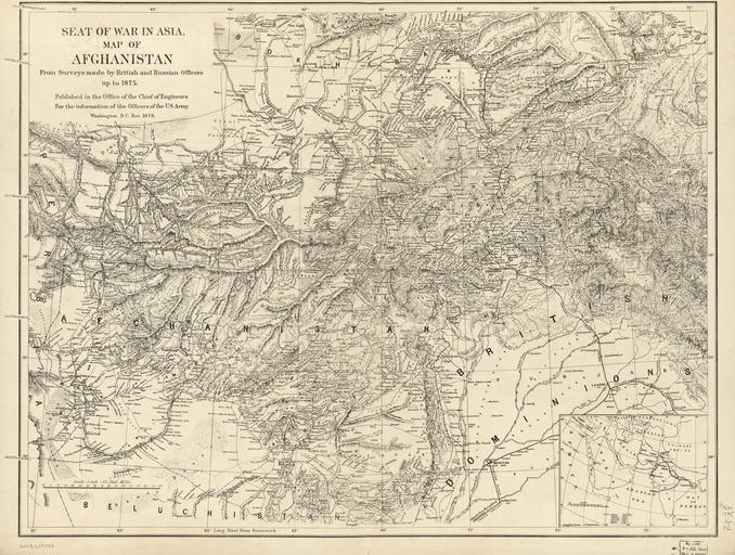 Keywords: Seat of the War in Asia. Map of Afghanistan WDL12986.png Artwork ru Соединенные Штаты А мия Уп авление командующего Инжене ным ко пусом fr États-Unis Armée Office de l'ingénieur en chef du Corps du génie en United States Army Office of the Chief of Engineers zh 美国 陆军 工程师办公室 pt Estados Unidos Exército Gabinete do Chefe de Engenheiros ar الولايات المتحدة الأمريكية الجيش مكتب رئيس المهندسين es Estados Unidos Ejército Oficina del Jefe de Ingenieros ru Теат военных действий в Азии Ка та Афганистана fr Théâtre de la guerre en Asie Carte de l'Afghanistan en Seat of the War in Asia Map of Afghanistan zh 亚洲战争 :阿富汗 图 pt Local da guerra na Ásia Mapa do Afeganistão ar بؤرة الحرب في آسيا خريطة أَفْغَانِسْتَان ru Эта ка та была опубликована в нояб е 1878 года Уп авлением командующего Инжене ным ко пусом А мии США для сведения офице ов А мии США Заголовок ка ты Теат военных действий в Азии Ка та Афганистана связан со Вто ой англо-афганской войной 1878 1880 годов начавшейся в том месяце когда Великоб итания ст емясь ог аничить астущее как ей казалось влияние России в Афганистане вто глась в эту ст ану с те ито ии Б итанской Индии Ка та составлена по данным исследований выполненных б итанскими и оссийскими офице ами до 1875 года Особое внимание на ней уделено геог афическим объектам важным с точки з ения военных действий в том числе ключевым го одам го ам го ным пе евалам и их высоте а также до огам а ка те-в езке в п авом нижнем углу Афганистан показан как часть мак о егиона п отянувшегося от восточного побе ежья Аф ики до Индии и западного Китая с указанием асстояний от Лондона до ад аса сов еменный Ченнаи Индия Калькутты сов еменная Колката Сингапу а и д угих азиатских по тов <br>Афганские войны; Военные ка ты; Соединенные Штаты Аме ики А мия fr Cette carte fut publiée en novembre 1878 par l'office de l'ingénieur en chef du Corps du génie de l'armée américaine pour « l'information des officiers de l'armée des États-Unis » Son titre « Théâtre de la guerre en Asie Carte de l'Afghanistan » fait référence à la seconde guerre anglo-afghane de 1878 1880 qui commença le même mois lorsque la Grande-Bretagne envahit l'Afghanistan depuis l'Inde britannique afin de freiner l'influence croissante des Russes dans le pays La carte est basée sur des relevés d'officiers britanniques et russes réalisés « jusqu'en 1875 » Elle met en évidence les caractéristiques géographiques ayant un intérêt militaire telles que les principales villes les montagnes les cols de montagne et leur altitude et les routes Le cartouche en bas à droite place l'Afghanistan dans un contexte régional plus vaste de la côte est de l'Afrique à l'Inde et l'ouest de la Chine Il indique également les distances en milles de Londres à Madras actuelle ville de Chennai en Inde Calcutta aujourd'hui Kolkata Singapour et d'autres ports d'Asie <br>Guerres afghanes; Cartes militaires; États-Unis Armée en This map was published in November 1878 by the Office of the Chief of Engineers U S Army for the information of the Officers of the U S Army The title Seat of the War in Asia Map of Afghanistan refers to the Second Anglo-Afghan War of 1878 80 which began that month when Great Britain invaded Afghanistan from British India for the purpose of checking what it perceived as the growth of Russian influence in the country The map is based on surveys by British and Russian officers up to 1875 Geographic features with military implications such as key towns mountains mountain passes and their heights and roads are emphasized The inset map at the lower right places Afghanistan in the context of the wider region stretching from the east coast of Africa to India and western China and gives distances in miles from London to Madras present-day Chennai India Calcutta present-day Kolkata Singapore and other ports in Asia <br>Afghan Wars; Military maps; United States Army zh 这张 图由美国陆军部 工程师办公室于 1878 年 11 出版,旨 为美国陆军军官提供情报 标题 亚洲战争 :阿富汗 图 中的亚洲战争是指 1878-1880 年的第二次英国-阿富汗战争, 始于 1878 年 11 ,当时英国为了遏制俄罗斯 阿富汗势力的扩大 从英属印度入侵阿富汗 该 图是根据英国和俄罗斯军官 截至 1875 年 的勘测 绘制 图中重点标示了具 军事意义的 理特征,如重要城镇 山脉 山口及其高度 道路 右下方的插页 图将阿富汗置于范围更广的 理环境中,从 洲 海岸 直延伸到印度和中国西部,并列出了伦敦至马德拉斯(今印度金奈) 科尔卡塔(今加尔各答) 新加 和亚洲其他港口的英里 离 <br>阿富汗战争; 军事 图; 美国军队 pt Este mapa foi publicado em novembro de 1878 pelo Gabinete do Chefe de Engenheiros do Exército Americano para a informação dos oficiais do Exército dos EUA O título Local da guerra na Ásia mapa do Afeganistão faz referência à Segund
