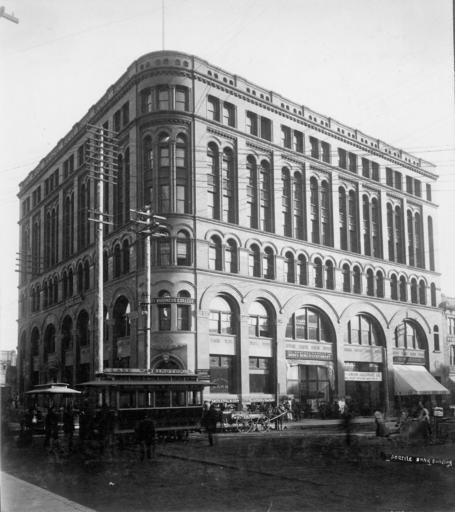 Keywords: Seattle National Bank Building, southeast corner of Yesler Way and S 2nd Ave, Seattle, Washington, ca 1891 (LAROCHE 323).jpeg Pioneer Square-Skid Road Photograph Creator Frank La Roche Caption on image Seattle Bank Building Also known as the Pacific Block and the Interurban Building Subjects LCTGM Street railroads--Washington State --Seattle; Carriages coaches--Washington State --Seattle Subjects LCSH Seattle National Bank Building Seattle Wash ; Yesler Way Seattle Wash ; Second Avenue Seattle Wash ca 1891 Institution University of Washington UWASH-LAROCHE-source accession number laroche 323 PD-old-auto-1923 1936 Information field Order Number LAR107 Interurban Building Streetcars in Seattle historic Seattle Washington in the 1890s Black and white photographs |