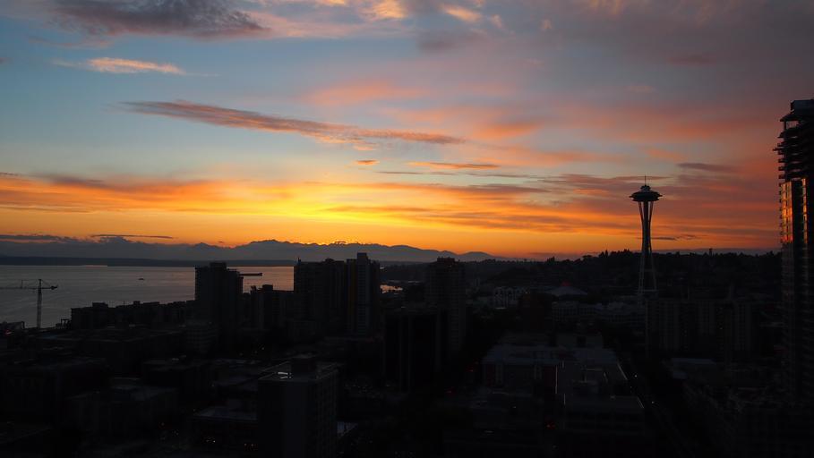 Keywords: seattle sunset mountains the olympics scenic evening buildings space needle city urban view famous tourism