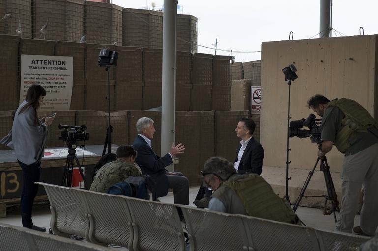| Keywords: SecDef visits Iraq 141209-D-DT527-205.jpg en Secretary of Defense Chuck Hagel speaks with Jim Sciutto of CNN during an interview at Baghdad International Airport Dec 9 2014 Photo by Master Sgt Adrian Cadiz Released 2014-12-09 Master Sgt Adrian Cadiz https //www dvidshub net/image/1692585 141209-D-DT527-205 2014-12-09 16 09 BAGHDAD IQ PD-USGov Jim Sciutto Chuck Hagel Images from DoD uploaded by Fæ | ||||