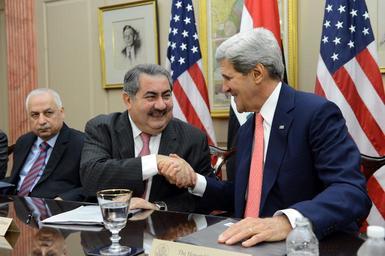 | Keywords: Secretary Kerry and Iraqi Foreign Minister Zebari Shake Hands at the Fourth Meeting of the U.S.-Iraq Political and Diplomatic Joint Coordination Committee.jpg en U S Secretary of State John Kerry and Iraqi Foreign Minister Hoshyar Zebari shake hands after delivering remarks at the fourth meeting of the Political and Diplomatic Joint Coordination Committee JCC under the U S -Iraq Strategic Framework Agreement SFA at the U S Department of State in Washington D C on August 15 2013 State Department photo/ Public Domain 2013-08-15 10 36 44 http //www flickr com/photos/statephotos/9515798475/sizes/o/in/photostream/ U S Department of State U S Department of State http //flickr com/photos/9364837 N06/9515798475 2013-08-15 18 50 41 United States Government Work PD-USGov Uploaded with UploadWizard John Kerry in 2013 |