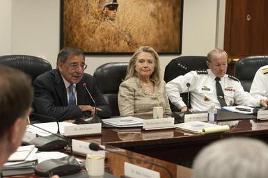 | Keywords: Secretary of State Hillary Clinton meets with Gen. Martin Dempsey 120515-D-BW835-052.jpg en Secretary of State Hillary Clinton center and Chairman of the Joint Chiefs of Staff Gen Martin Dempsey right listen as Secretary of Defense Leon E Panetta speaks with senior department officials and combatant commanders during a meeting at the Pentagon May 15 2012 The meeting covered issues which affect the military as well as diplomacy around the world 2012-05-15 Photo by Erin A Kirk-Cuomo https //www dvidshub net/image/582439 120515-D-BW835-052 2012-05-17 13 15 WASHINGTON DC US PD-USGov Hillary Rodham Clinton in 2012 Leon Panetta Martin E Dempsey Images from DoD uploaded by Fæ |