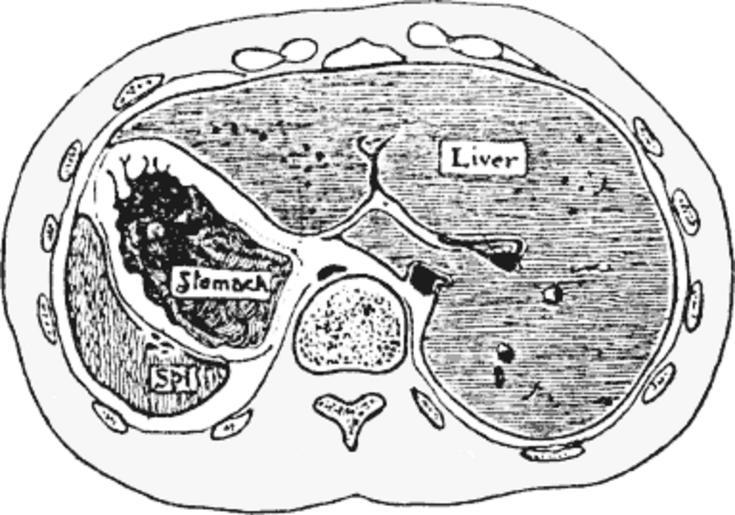 | Keywords: Section through epigastrium area subjected to greatest pressure.gif An Illustration from The Corset Published in New York Medical Journal November 5 1887 1887-11-05 Robert L Dickinson Copyright has expired due to the age of the publication PD-old Results of corset use |