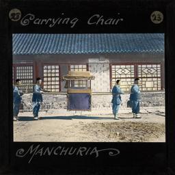 Keywords: Sedan Chair, Manchuria, ca. 1882-ca. 1936 (imp-cswc-GB-237-CSWC47-LS8-023).jpg en <br> Sedan Chair Manchuria ca 1882-ca 1936 Carrying Chair Photograph of a sedan chair being carried by 4 men The men are all dressed in traditional Chinese dress Behind them is a building with a decorative framework to the front ; This belongs to a series of Church of Scotland Foreign Missions Committee lantern slides relating to the Scottish missionary Dugald Christie Dugald Christie was born in Glencoe in Scotland and studied medicine under the auspices of the Edinburgh Medical Missionary Society In 1882 along with his first wife Elizabeth he went to Manchuria to work as a medical missionary of the United Presbyterian Church of Scotland He worked initially in Newchang and later moved to the capital of Mukden where he opened Manchuriaas first hospital in 1884 In 1912 he established Mukden Medical College Dugald Christie retired in 1923 and died in Edinburgh in 1936 Photographer Unknown Filename imp-cswc-GB-237-CSWC47-LS8-023 tif Coverage date 1882/1936 Part of collection International Mission Photography Archive ca 1860-ca 1960 Geographic subject region Manchuria Type images Part of subcollection Photographs from the Centre for the Study of World Christianity University of Edinburgh U K ca 1900-ca 1940s Repository name Centre for the Study of World Christianity Archival file impaunpub_Volume7/1686 url Repository address The University of Edinburgh School of Divinity New College Mound Place Edinburgh EH1 2LX United Kingdom Geographic subject country China Format aacr2 1 lantern slide 8 x 8 cm Geographic subject continent Asia Rights Contact the repository for details Part of series Dugald Christie LS8 Repository email divinity-CSWC ed ac uk Subject lcsh Keyword Transportation; Sedan chairs Date created 1882/1936 Publisher of the digital version University of Southern California Libraries Subject aat genre group portraits Format aat lantern slides Legacy record ID impa-m69130 Access conditions http //www ed ac uk/schools-departments/divinity/research/centres/world-christianity/collections-resources File GB 237 CSWC47/LS8/23 1882/1936 date created author http //digitallibrary usc edu/cdm/ref/collection/p15799coll123/id/64805 PD-old-70-1923 Magic lantern images Images from USC Digital Library uploaded by Fæ International Mission Photography Archive ca 1860-ca 1960