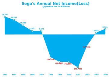 | Keywords: Sega Annual Icome(Loss) 1993-2004.svg en This is a graph of Sega's Annual Net Income for the fiscal years of 1993-2004 The data comes from Sega's 1998 2000 2002 and 2004 Annual Reports own Raffage 2009-09-28 Sega Sega Annual Income(Loss) 1993-2004.svg en This is a graph of Sega's Annual Net Income for the fiscal years of 1993-2004 The data comes from Sega's 1998 2000 2002 and 2004 Annual Reports own Raffage 2009-09-28 Sega | ||||