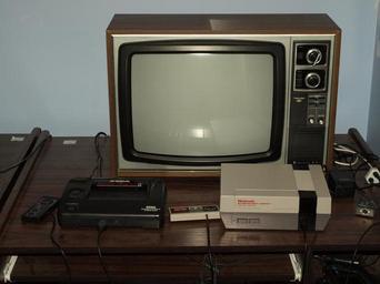 Keywords: Sega Master System and NES Picture2.jpg en A Sega Master System and Nintendo Entertainment System hooked up to an old Sanyo TV set 2011-11-05 own Matthew Paul Argall cc-zero Uploaded with UploadWizard Sega Master System Nintendo Entertainment System original Sanyo television sets