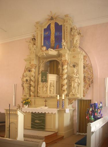 Keywords: Sehnde Kreuzkirche Altar.jpg de Sehnde ev Kreuzkirche Barockaltar own Rabanus Flavus 2010-07-13 Kreuzkirche Sehnde Baroque pulpit altars in Germany Lutheran altars