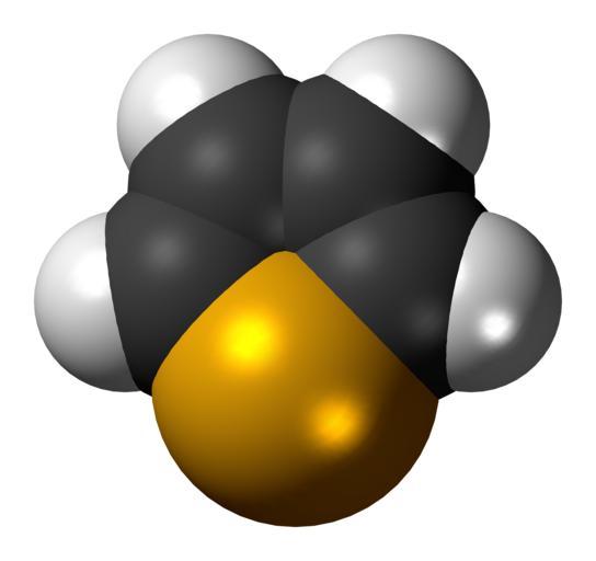 Keywords: Selenophene-3D-spacefill.png Space-filling model of the selenophene molecule a heterocycle of the metallole class Colour code 505050 Carbon C black<br> F0F0F0 Hydrogen H white<br> EBB400 Selenium Se yellow-brown<br> 2011-06-01 own DS Visualizer Jynto talk Ball-and-stick version cc-zero Selenium heterocycles Simple aromatic rings Images by Jynto |