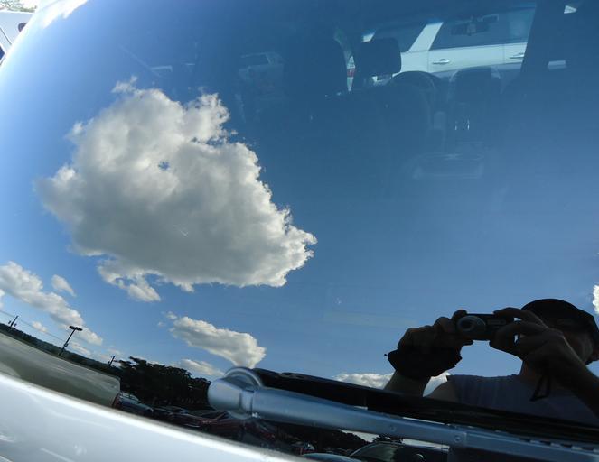 Keywords: Self-photo of reflection in rear window of car.jpg en Reflection in the rear window of a minivan The cloud is visible The photographer me is seen lower right 2012-08-12 own Tomwsulcer cc-zero Uploaded with UploadWizard Reflections Cumulus humilis clouds |