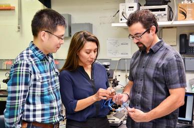 Keywords: Los investigadores de IBM Research Chi Xiong, Norma Sosa y Will Green preparan una prueba de sensores en el laboratorio. Copyright: IBM Research