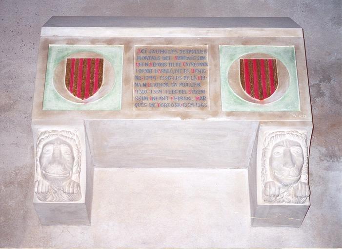 Keywords: Sepulcre d'Alfons el Benigne.jpg Alfonso IV of Aragon 1299-1336 her wife Eleanor of Castile 1307 “1359 and Ferdinand of Aragon marquis of Tortosa Placed in La Seu Vella Lleida Spain Alfons IV d'Aragó 1299-1336 Elionor de Castella i el infant Ferran d'Aragó a la Seu Vella de Lleida Alfonso IV de Aragón 1299-1336 En el sepulcro también se encuentran los restos de su esposa la reina Leonor de Castilla 1307-1359 y los restos del infante Fernando de Aragón 1310-1359 marqués de Tortosa e hijo de los dos anteriores El sepulcro se encuentra en la catedral de la Seu Vella de Lerida España RI-51-0000156 ct 154 realització pròpia / self-made 2005 Tantarantana Old Cathedral of Lleida Alphonse IV of Aragon Royal tombs of Kingdom of Aragon Eleanor of Castile 1307 “1359 Ferdinand of Aragon 1363 |