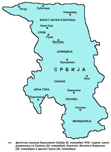| Keywords: Serbia1918 2.png English de facto borders of the Kingdom of Serbia in November 26 1918 after unification with Syrmia November 24 Banat Bačka and Baranja November 25 and Montenegro November 26 - Serbian language version <br>Serbian фактичке г анице К аљевине С бије 26 новемб а 1918 године после уједињења са С емом 24 новемб а Банатом Бачком и Ба ањом 25 новемб а и Ц ном Го ом 26 новемб а - ве зија на с пском језику own 2012 PANONIAN Cc-zero References Published references Drago Njegovan Prisajedinjenje Vojvodine Srbiji Novi Sad 2004 Drago Njegovan Prisajedinjenje Srema Banata Bačke i Baranje Srbiji 1918 - dokumenti i prilozi Novi Sad 2001 Lazo M Kostić Srpska Vojvodina i njene manjine Novi Sad 1999 Dimitrije Boarov Politička istorija Vojvodine Novi Sad 2001 Dr Tomislav Bogavac Nestajanje Srba Niš 1994 Čedomir Popov - Jelena Popov Autonomija Vojvodine - srpsko pitanje Sremski Karlovci 2000 Rade Šumonja Spomenica oslobođenja Sombora 1918-1998 Sombor 1998 Internet references http //terkepek adatbank transindex ro/kepek/netre/167 gif Map http //www historyonmaps com/BWSamples/Demarkacio htm Map http //www lemontree hu/egyebkep/linkkep/history/map/XX_szazad/1918-1938_balkan gif Map Maps of the Kingdom of Serbia Serbia1918012 Banat Bačka and Baranja Serbia1918012 Maps of Serbia during World War I Serbia1918012 Maps of the history of Vojvodina Serbia1918012 Maps of the history of Syrmia Serbia1918012 Maps of the history of Montenegro in modern times Serbia1918012 Maps in Serbian |