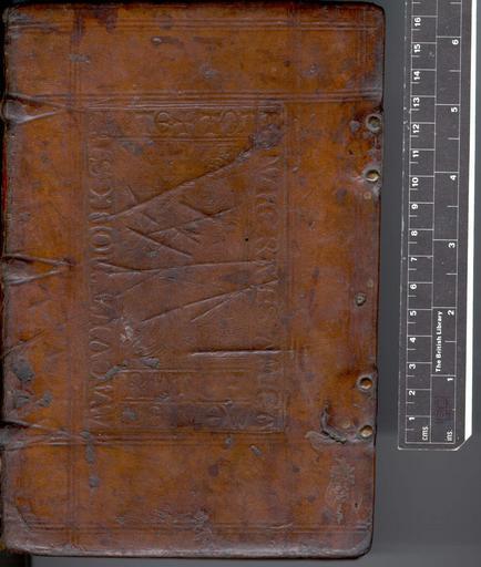 | Keywords: Sermones quadragesimales - Upper cover (c66e6).jpg Style Panel design Religious miscellaneous; Caption Upper cover; Colour Brown; Edge Unspecified exhibition history Decorative Technique Tooled in blind Panel stamp in blind; Cover Material Calf Wooden boards Remains of 2 pairs of clasps Upper cover damaged lower cover worn Printed binder's waste used for endleaves Macchi states; c 1498-1515 Normandy Robert or Richard Macé Annunciation panel-stamp 6 known examples D Gid- M -P Laffitte Les reliures à plaques françaises p 39-40 28 n 1 ; Virgin's coronation panel-stamp 6 known examples D Gid- M -P Laffitte Les reliures à plaques françaises p 92-93 64 n 1 object history Text 1506; Lyons; Unspecified object type Cc-zero place of creation Binding England place of discovery See J B Oldham Blind Panels of English Binders Cambridge 1958 upper cover REL6 signed R Mace lower cover BIB9 British Library image http //www bl uk/catalogues/bookbindings/LargeImage aspx RecordId 020-000002666 ImageId ImageId 40938 Copyright BL Sermones quadragesimales Uploaded with GWToolset Sermones quadragesimales - Upper cover c66e6 http //www webarchive org uk/bldatasets/bindings/5426_3 jpg Bookbinding 16th-century bookbinding British Library Bookbindings |