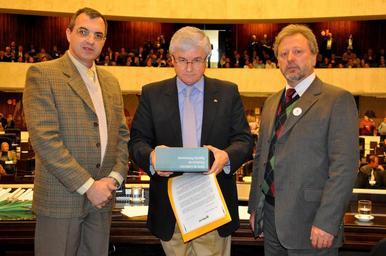 Keywords: Presidente do CREA, Alváro Cabrini, o presidente da AL, deputado Valdir Rossoni e o presidente da ACAMPAR, Bento Batista / Foto: Maria de Freitas (uso do crédito obrigatório) sessão