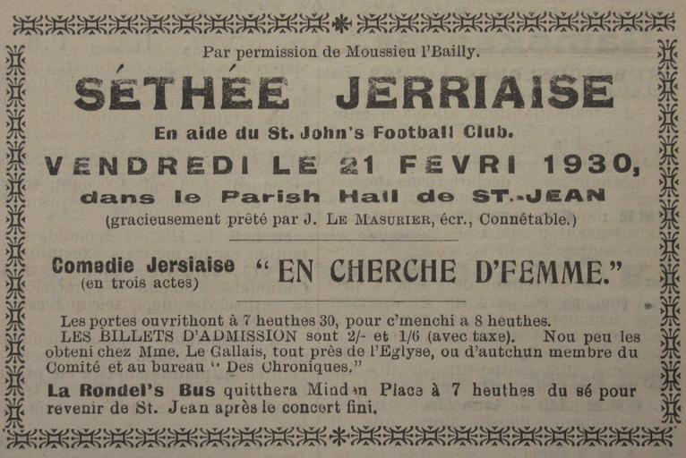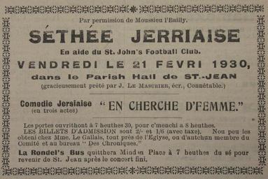 Keywords: Séthée Jèrriaise 21 Févri 1930.jpg Séthée Jèrriaise Jèrri 21 Févri 1930 En Cherche d'Femme own photo 2010-02-19 13 39 51 Man vyi PD-old PD-1996 Theatre of Jersey 1930 in theatre Jèrriais Advertisements in Jersey Edwin J Luce Elie Town halls in Jersey Saint John Jersey February 1930 in Europe |