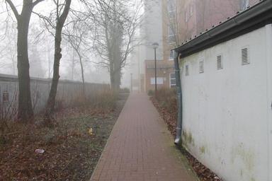 Keywords: settlement city buildings houses blocks away trees fog atmosphere mood