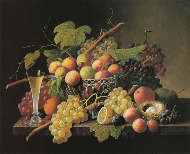 | Keywords: Severin Roesen - Still Life.jpg Artwork creator Severin Roesen undated 19th century Oil canvas in 21 75 26 75 Columbus Museum of Art Columbus Ohio accession number 1980 032 object history credit line Acquired through exchange Bequest of J Willard Loos Signed lower right S Roesen Columbus Museum of Art 1988 The American Collections p 14 Scanned by uploader from Columbus Museum of Art 1988 The American Collections p 15 PD-old-100 Severin Roesen 19th-century still life paintings Paintings in the Columbus Museum of Art Still life paintings of fruits |