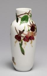 Keywords: Sèvres Porcelain Manufactory - Fuchsia Vase - Walters 48914.jpg At Sèvres in the early 20th century the enameller André-Fernand Thesmar 1843-1912 introduced translucent enamels set in gold cloisons or compartments with gold foil backings Because of its attractive milky white color he revived the use of the soft-paste or artificial porcelain of the 18th century This vase which is identical in its naturalistic style and enamel technique to the work of Thesmar is inscribed in gold with the signature Lerosey who has not yet been identified The porcelains decorated in the the 1890s at the Lerosey studio 11 rue de la Paix Paris are painted not enameled Another fuschia vase by Thesmar made at Sevres in 1907 is in the Musee d'Orsay OAO 213 ca 1907 soft-paste porcelain translucent enamel gold cm 17 6 accession number 48 914 27203 Henry Walters Baltimore date and mode of acquisition unknown Walters Art Museum Henry Walters Acquired by Henry Walters place of origin Sèvres France Walters Art Museum license Sèvres porcelain in the Walters Art Museum Media contributed by the Walters Art Museum needs category review