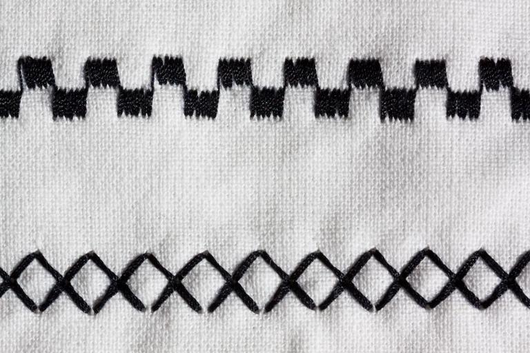 Keywords: sewing machine embroidery black white sew hand labor tinker fabric zig zag pattern diamond four corner macro