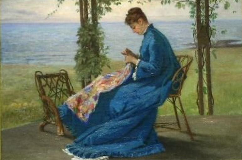 Keywords: Sewing on the Veranda ca1875 byFrankHillSmith.png Frank Hill Smith 1841-1904 SEWING ON THE VERANDA Signed and dated F Hill Smith '75 Oil on canvas 17 1/4 x 25 1/4 inches Doyle New York 175 East 87th Street New York NY 10128 American Art 8 00 AM PT - May 26th 2004; Lot 57 ~ 1875 F Hill Smith PD-Art Frank Hill Smith |