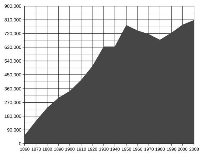 | Keywords: SFPopulation.svg en SF Population Growth 1860-2008 http //www census gov/population/www/documentation/twps0027/tab09 txt 1860 http //www census gov/population/www/documentation/twps0027/tab10 txt 1870 http //www census gov/population/www/documentation/twps0027/tab11 txt 1880 http //www census gov/population/www/documentation/twps0027/tab12 txt 1890 http //www census gov/population/cencounts/ca190090 txt 1900-1990 http //www census gov/popest/counties/tables/CO-EST2008-01-06 xls 2000 and 2008 est Shep See upload date File SFPopulation18602008 png Data used for this image 1860 56802 1870 149473 1880 233959 1890 298997 1900 342782 1910 416912 1920 506676 1930 634394 1940 634536 1950 775357 1960 740316 1970 715674 1980 678974 1990 723959 2000 776733 2008 808976 Demographics of San Francisco |