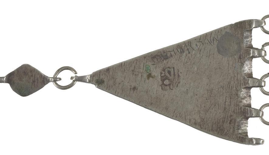 | Keywords: Sh Sharayan - Pair of Linked Triangular Pendants from a Woman?s Headpiece - Walters 572313 - Mark B.jpg The triangular pedants are cast and the top and the five bottom loops soldered on The top loop holds a ring which connects the main pendant with a small rhombic element decorated with an attached five-ring filigree-like motif This element has an additional loop to fasten it at the headscarf The décor of the triangles combines a stylized rosette with tear-shaped elements; a bead-molded border frames the motif The single and double chains which are hanging down from the loops of the triangles fit together by small rings The missing single or double chain was originally fastened at the upper loop of one and the lower loop of the other triangle This arrangement was used because the chains were twisted toward each other On the back of both triangles is an Arabic stamp with the date nusfi 1287 the term nusfi means half In AH 1287 AD 1870/1 al-Hadi Galib ruled in Sana a' but also Saykh Muhsin b Ali Mu'id In addition there is an engraved Hebrew inscription with the name of the silversmith Sh lomo Sharayan mahasit The term mahasit means half The elongated hooks are probably modern additions 1287 AH/AD 1870-1871 silver Triangle H without loops 2 3/8 x W of base 1 7/8 in 6 x 4 7 cm accession number 57 2313 80917 Mr Benjamin Zucker Zucker Family Trust and Mr Derek Content New York and London by purchase Walters Art Museum Joint gift to the Walters Art Museum Baltimore and the Israel Museum Jerusalem by Mr Benjamin Zucker and Mr Derek Content in honor of Mrs Barbara Zucker and Mrs Amanda Content 2010 Stamp Arabic nusfi 1287 AH Engraving Hebrew S lomo Sarayan mahasit place of origin Raydah Yemen Walters Art Museum license Jewellery in the Walters Art Museum South Arabian art in the Walters Art Museum Sh Sharayan Media contributed by the Walters Art Museum needs category review Sh Sharayan - Pair of Linked Triangular Pendants from a Woman?s Headpiece - Walters 572313 - Mark B.jpg The triangular pedants are cast and the top and the five bottom loops soldered on The top loop holds a ring which connects the main pendant with a small rhombic element decorated with an attached five-ring filigree-like motif This element has an additional loop to fasten it at the headscarf The décor of the triangles combines a stylized rosette with tear-shaped elements; a bead-molded border frames the motif The single and double chains which are hanging down from the loops of the triangles fit together by small rings The missing single or double chain was originally fastened at the upper loop of one and the lower loop of the other triangle This arrangement was used because the chains were twisted toward each other On the back of both triangles is an Arabic stamp with the date nusfi 1287 the term nusfi means half In AH 1287 AD 1870/1 al-Hadi Galib ruled in Sana a' but also Saykh Muhsin b Ali Mu'id In addition there is an engraved Hebrew inscription with the name of the silversmith Sh lomo Sharayan mahasit The term mahasit means half The elongated hooks are probably modern additions 1287 AH/AD 1870-1871 silver Triangle H without loops 2 3/8 x W of base 1 7/8 in 6 x 4 7 cm accession number 57 2313 80917 Mr Benjamin Zucker Zucker Family Trust and Mr Derek Content New York and London by purchase Walters Art Museum Joint gift to the Walters Art Museum Baltimore and the Israel Museum Jerusalem by Mr Benjamin Zucker and Mr Derek Content in honor of Mrs Barbara Zucker and Mrs Amanda Content 2010 Stamp Arabic nusfi 1287 AH Engraving Hebrew S lomo Sarayan mahasit place of origin Raydah Yemen Walters Art Museum license Jewellery in the Walters Art Museum South Arabian art in the Walters Art Museum Sh Sharayan Media contributed by the Walters Art Museum needs category review |