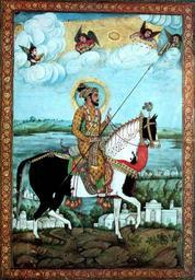 Keywords: Shah Jehan with Angel musicians.jpg cm 53 4 36 9 Joseph J Palackal private collection en Shah Jahan 1592-1666 the fifth ruler of the Mughal Empire and the creator of the Taj Mahal is riding upon his royal horse on the rugged banks of the river Jamuna Taj Mahal is not built yet Following the Christian tradition introduced to the Mughal court by the Jesuit missionaries at the time of Akhbar the Emperor appears like a saint with a halo around his head Four angels two on each side of the divine effulgence descend from the heavenly clouds The angel on the right counteracts the sharpness of the Emperor's spear with the sweetness of music flowing from the trumpet The second angel on the right is putting the third necklace on the shoulder of the Emperor The second angel on the left is offering a crown and the angel at the extreme left is holding http //www thecmsindia org/art html PD-old Other versions Paintings of Shah Jahan Paintings of angels 17th-century Mughal miniatures Watercolor paintings of men of India Horse riders in art of India |