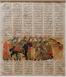 Keywords: Shahnama Met 57.51.36.jpg شاهنامه از قرن هشتم هجری که داستان رستم و اسفندیار را نوشته است Folio from a manuscript of Firdausi's Shahnameh Rustam and Esfandiar Page d'un manuscript du Shahnameh de Ferdowsi Rustam and Esfandiar islamic 741 1341 ink watercolour opaque gold paper cm 36 8 30 2 Institution Metropolitan Museum of Art Department of Islamic Art 140008731 object history ProvenanceEvent commission al-Hasan Qawam al-Daula wa'l-Din RelativeLocation Shiraz Iran exhibition history credit line ProvenanceEvent bequest Cora Timken Burnett 1956 accession number 57 51 36 Marie-Lan Nguyen PD-old-100-1923 other versions Assessments 1 Islamic manuscripts in the Metropolitan Museum of Art Shahnameh |