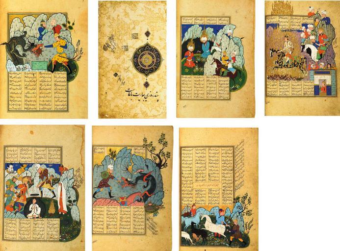 Keywords: Shahnamah.jpg en An illustrated manuscript of the Shah Namah that may have belonged to Jahangir Source http //www christies com/LotFinder/search/LotDetail asp sid intObjectID 3052252 SE CMWCAT02+592+1839017235+ QR M+1+261+Aqc0000900+569++Aqc0000900+ entry india SU 1 RQ True AN 262 downloaded Oct 2001 ABU'L QASIM FIRDAWSI D AH 416/1025 AD SHAHNAMEH Khorassan circa 1570 Persian manuscript on light buff paper 549ff with 25ll of black nasta'liq in four gold-outlined columns titles in red opening gold and polychrome illuminated bifolio catch words in black with seventy six miniatures in gouache heightened with gold opening flyleaf with gold floral illumination and roundel containing seal impression inscribed Shah Beg ibn Mirza beg Ataliq library inscriptions stating that the Shahnameh was bought and entered the library on 4th isfandarnadh regnal year 11 with seal impression dated 1032 slight flaking of miniatures slight water staining otherwise very good condition later tan morocco binding with gold tooled medallions and spandrels Folio 14¼ x 9½in 36 x 24 2cm ; text area 9½ x 5¾in 24 2 x 14 5cm Lot Notes This Shahnameh was produced for an Uzbek patron The name on the seal on the opening flyleaf is Shah Beg ibn Mirza Beg Ataliq as yet unidentified The style of the miniatures is close to Qazwin but the very strong colours and style of some of the headdresses suggest Herat The miniatures are the work of three or more artists and some of the subjects chosen for inclusion are unusual A close comparisom can be made with a near contemporaryShahnameh dated around 1576-7 Robinson B W Persian and Mughal Art Colnaghi exhibition catalogue London 1976 pp 32-47 The library note may be Mughal because of the way a Persian month is used and the style of writing and may have belonged to the Emperor Jahangir The name of the seal bearer is Rashid Khan but there is no record of an official with this name at the court of Jahangir The miniatures begin with f 3a Firdawsi in the presence of Sultan Mahmud of Ghazni with three courtiers ~ 1570 http //www columbia edu/itc/mealac/pritchett/00routesdata/1600_1699/jahangir/shahnamah/shahnamah html Shah Beg ibn Mirza Beg Ataliq PD-Art Uploaded with UploadWizard Shahnameh |