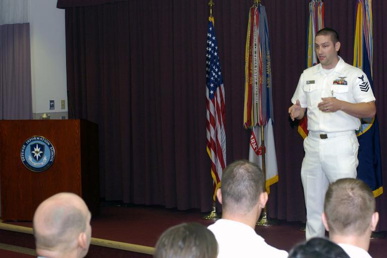 | Keywords: Shane T. McCoy addresses a graduating class.jpg DEFENSE INFORMATION SCHOOL Fort George G Meade Md “ Navy Petty Officer 1st Class Shane McCoy photojournalist for All Hands magazine delivers the graduation speech for the Basic Still Photography course 080-06 graduation here June 9 2006 During the 13-week course Basic Still Photography students are trained to create professional visual information products using the latest techniques and state-of-the art equipment in photography Department of Defense Photo by Navy Journalist Seaman William C Culp http //www dinfos osd mil/dinfosweb/photos asp newsId 128 photoId 1 2006-06-09 William C Culp PD-USGov-Military-Navy Military graduations Shane T McCoy |